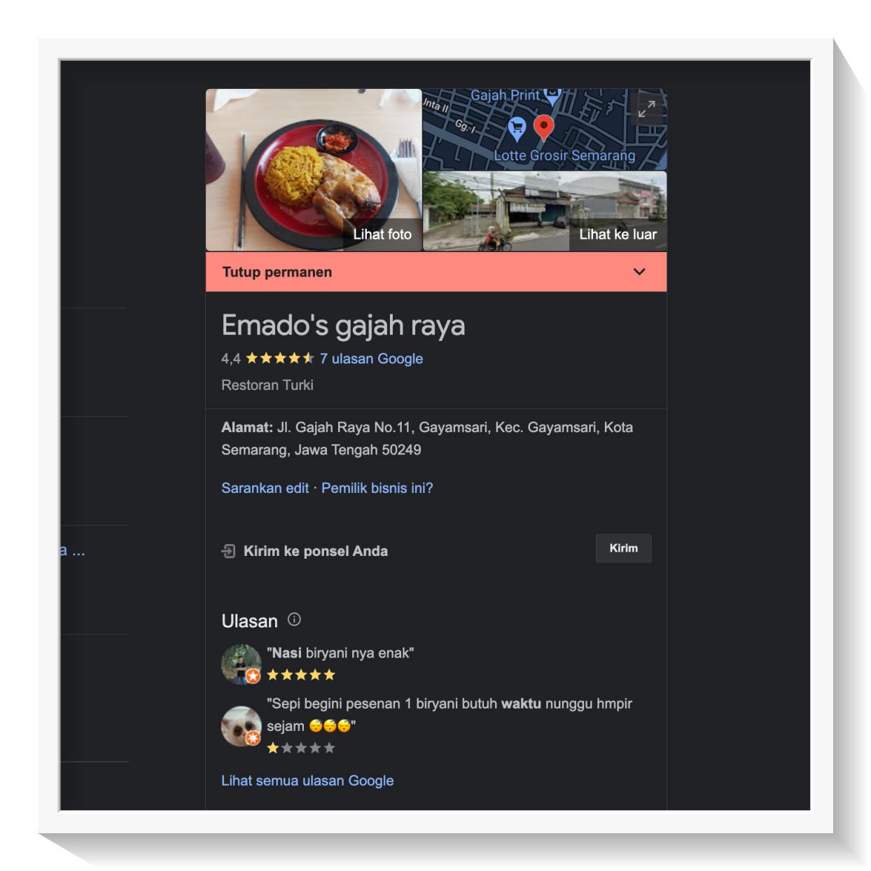 Saat membuka google, halamannya oleh google (map) sudah ditandai dengan tulisan tutup permanen. Restoran yang menawarkan hidangan khas Palestina ini tentu bukan satu-satunya di sini, masih ada beberapa outlet lagi di Kota Semarang.